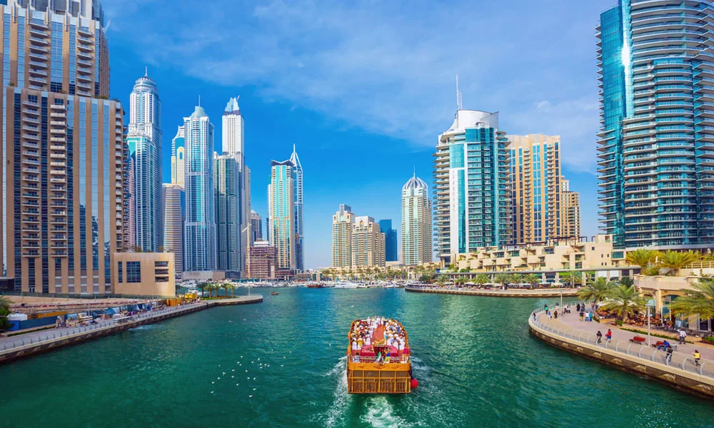 Witness Dubai's modern architecture by observing beachfront residential towers alongside populated yacht promenades.