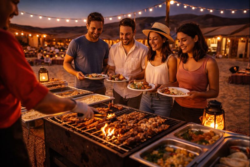 A decadent BBQ buffet with meat and plant-based choices is available to guests at the desert camp. For an evening that combines desert excitement with a relaxed dinner under the stars, take a look at our Abu Dhabi Dinner Safari.