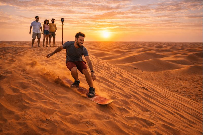 Families love sliding down powdery hills through sand boarding which provides both fun and adventure in desert terrain during their desert excursion.