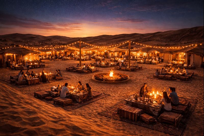 Guests explore sand dunes through adventure activities while enjoying cultural traditions and desert entertainment during the night stay at the desert camp staying immersed in Arabian desert lifestyle hospitality.